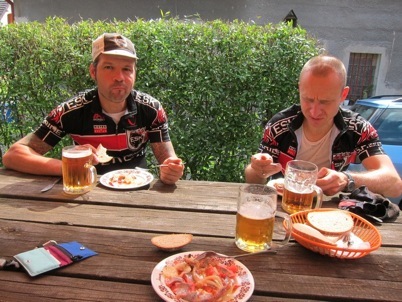 Das wir den Ort an seiner höchsten Stelle erreichten und uns Einheimische nach unten schickten nahmen wir ob der leeren Akkus in Kauf. Nur das die angepriesene Pinte zu hatte war weniger schön. Sollten wir die hart erkämpften Hm umsonst hergeschenkt haben? Nein, ein Ortsplan aus Zeiten des Prager Frühlings wies ein paar Meter weiter unten noch ein weiteres Hostinec aus. Nur leider war auch dieses verwaist. Als wir dem Hungertod nahe noch ein wenig rumlullerten bog der Kneipier auf den Hof. Toni intervenierte sofort, biß aber auf Basalt. Erst als die Dame den Hauses die Bühne betrat und uns jämmerliche Gestalten erblickte öffnete sich der Kühlschrank. Feinstes, frischgezapftes Bier und Zitronenbrause floß die Kehlen hinab. Die Frage ob es etwas Essbares gibt wurde mit Würstchen im Zwiebelbett und Heringssalat beantwortet. F(r)isch OK? F(r)isch hervorragend!
